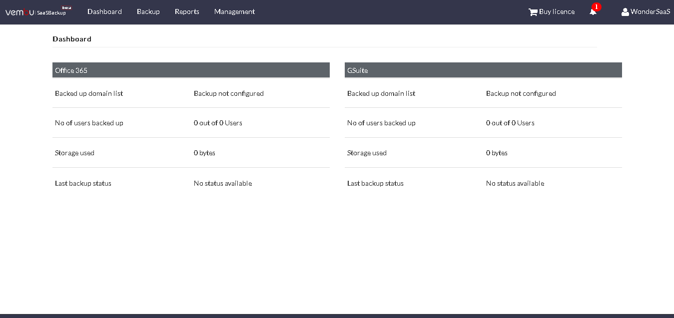 - 单击确定,您将被重定向到vembu saasbackup的仪表板。