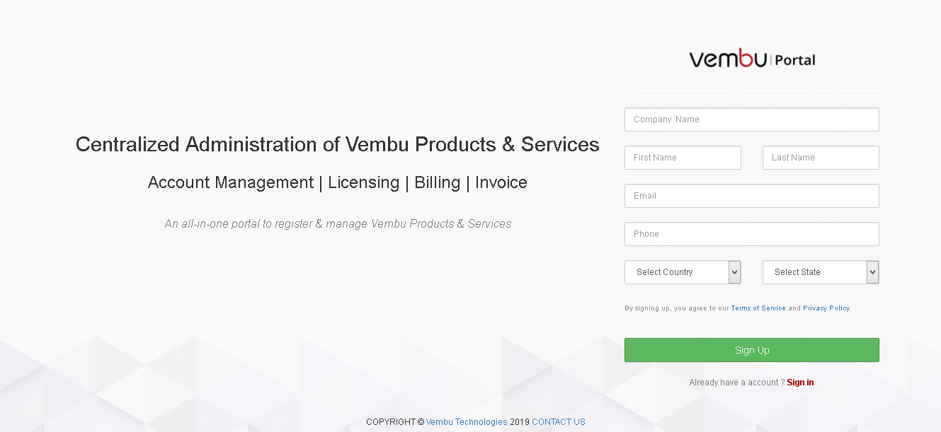 Vembu Portal是一个用于管理用户注册vembu产品和服务的一体化中心位置。用户还可以通过创建vembu Portal帐户来开始使用vembu saasbackup。